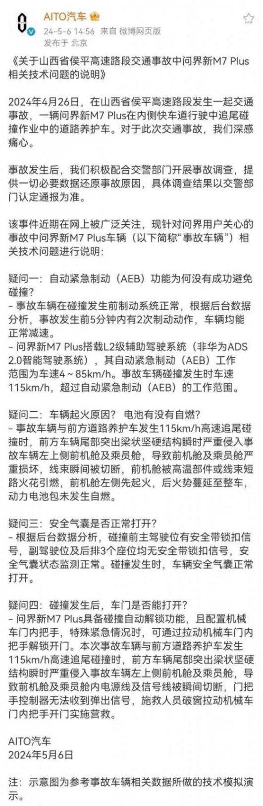 先辟個(gè)謠,在本次事故中,問界M7之所以獲得如此高的關(guān)注度,很大程度是因?yàn)槿A為是高階智駕輔助系統(tǒng)的推動(dòng)者,問界、阿維塔等車型,一直在各類智駕橫評(píng)中名列前茅,但此次事故中,車型版本為問界M7 Plus,并未搭載華為高階智駕功能,僅配備了AEB主動(dòng)剎車功能,所以事故發(fā)生時(shí)不存在“開啟高階智駕導(dǎo)致”這個(gè)說法。