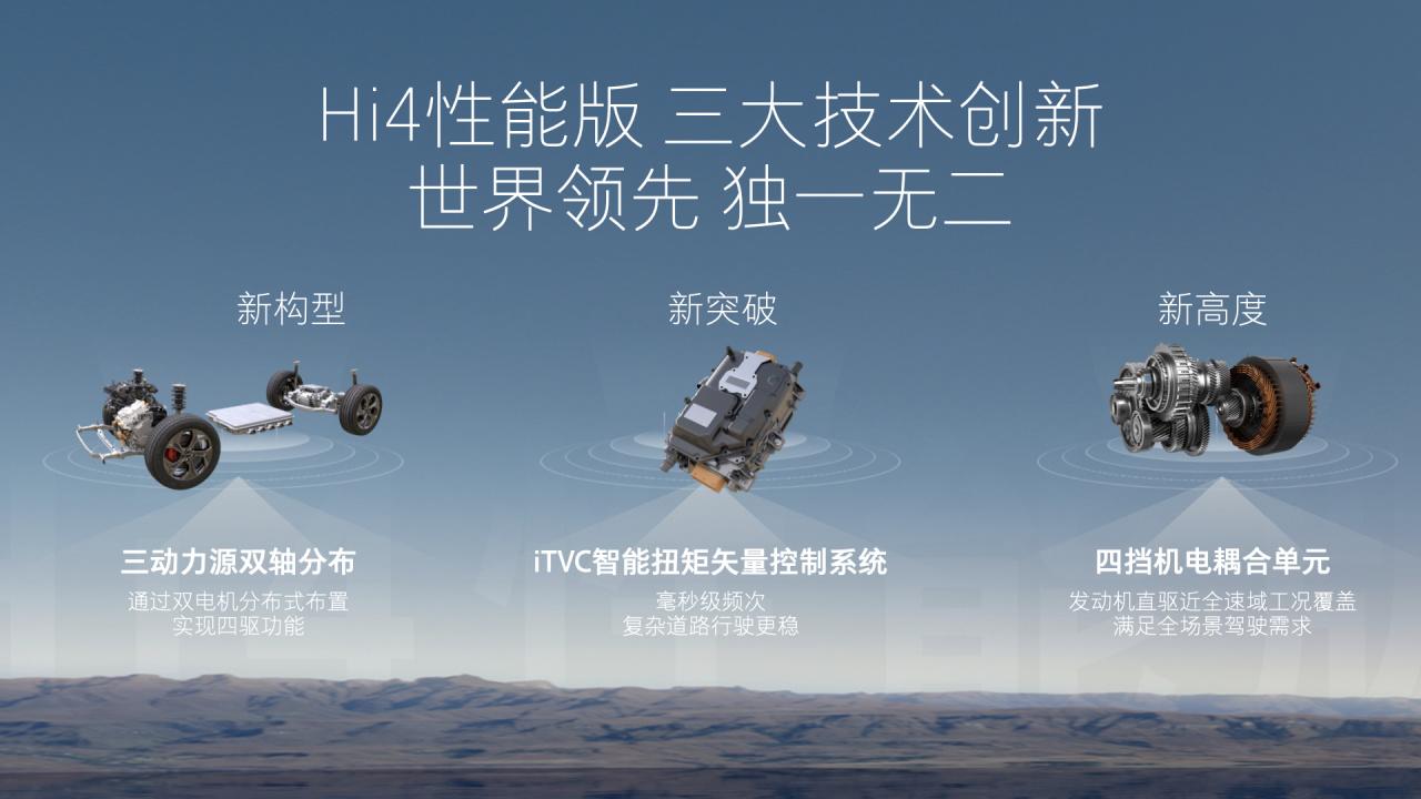 Hi4性能版由1.5T高熱效率發動機、80kW高度集成四擋變速箱、150kW高性能電后驅動橋、寧德時代35.04kWh三元鋰電池包以及全新升級的電控系統組成,系統綜合功率350kW,綜合扭矩達760N·m。