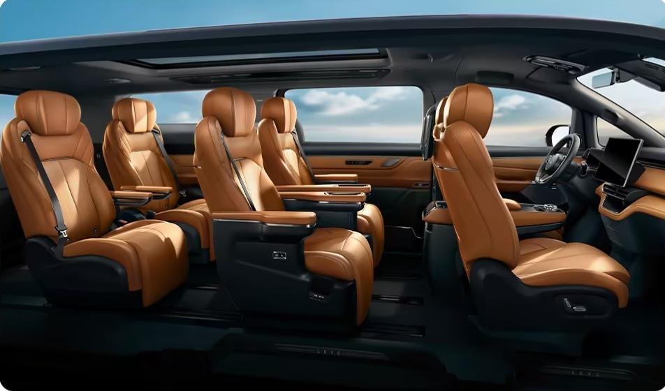 側面來看,新車側面看上去較為流暢,筆直的腰線從車頭延伸至尾。雙色拼接的設計進一步提升時尚感,黑色車窗營造出懸浮式車頂的視覺效果。此外,該車預計將支持雙側電滑門功能。車尾部分,新車采用了獨特的尾燈造型設計,貫穿式尾燈組從中間向兩邊擴散,點亮后極具辨識度。車身尺寸方面,新車長寬高分別為5316/1998/1940mm,軸距為3185mm。