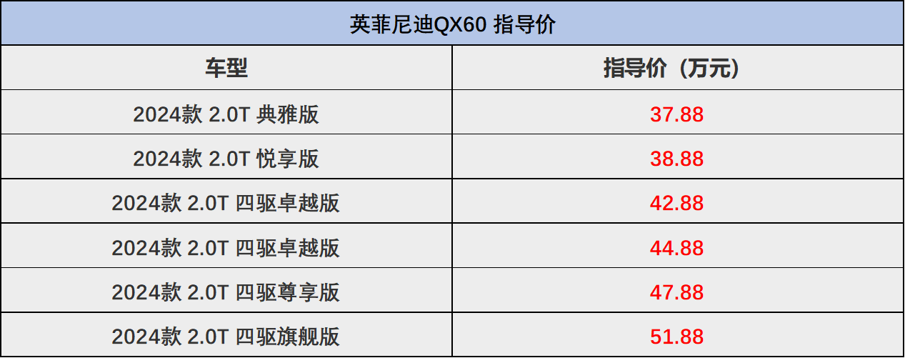 英菲尼迪QX60是一款豪華中大型SUV,在海外市場,它在定位上是與寶馬X5、奧迪Q7屬于同一級別,但是在國產之后,該車的售價區間變成了37.88萬至51.88萬,即便是頂配車型,也比奧迪Q7的入門款車型便宜11.4萬。這還不夠,如今這款車型的優惠幅度相當大,在部分地區(上海),它的優惠幅度來到了7萬元,以指導價37.88萬的2024款 2.0T 典雅版為例,優惠之后的價格僅為30.88萬,幾乎和一臺奧迪Q5L的價格相當,但是不管是級別還是尺寸,都比奧迪Q5L要大了一號。