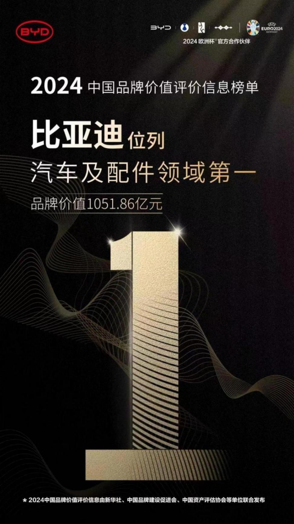 僅僅二十年時間,比亞迪不僅以300萬輛的成績走進全球車企銷量排行榜前十的位置,同時還在“2024中國價值評價信息”中以1051.86億元的品牌價值,位列汽車及配件領域第一。