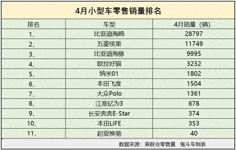 別不信,有銷量為證,鬼哥整理出4月小型車零售銷量排名榜。接下來,看看誰榜上有名?從榜單上可以看到,排名第一位的車型是比亞迪海鷗,這款小車勢頭很猛,4月零售銷量達到28797輛,成為榜單上的銷冠。這款車型的特點是小巧、時尚,而且,在比亞迪技術加持下,性能與口碑都不錯。