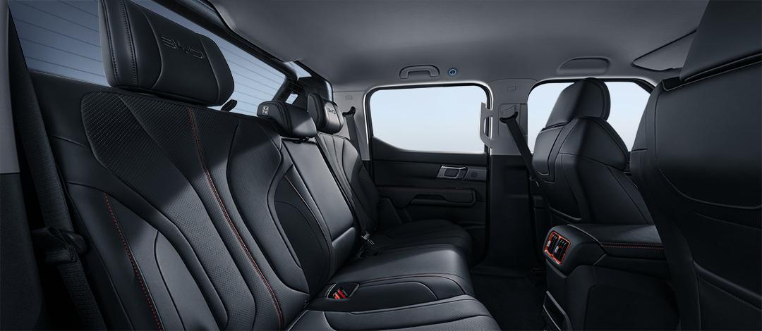 外觀方面,新車采用了硬朗霸氣的設計風格,車頭造型方正有力,大尺寸的BYD車標搭配長方形大燈以及貫穿式LED燈帶,顯得很有氣勢。側(cè)面設計同樣魁梧霸氣,配備了黑色輪眉、包圍、車頂行李架和龍門架等,強化了越野氣息,同時18英寸花瓣式輪圈和C柱的熏黑處理也增添了時尚感。