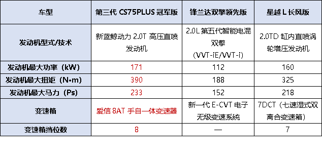 用戶在選車時,最為重視的就是性能配置。在SUV車型選擇上,越來越多的用戶都開始傾向于2.0排量的車型,因為相比1.5排量,更強的動力配置,在出行時能夠更輕松地應對各種路況。面對用戶需求,第三代CS75PLUS冠軍版和星越L長風版搭載的都是2.0T發(fā)動機, 鋒蘭達雙擎領(lǐng)先版搭載的則是2.0L電混雙擎。雖然同為2.0排量的車型,但我們從下面這個表格中可以看到,第三代CS75PLUS冠軍版所搭載的新藍鯨2.0T高壓直噴發(fā)動機, 最大功率達到了171kW,最大扭矩達到了390N·m,價格最低的第三代CS75PLUS冠軍版,反而是三款車中性能最強的那位。