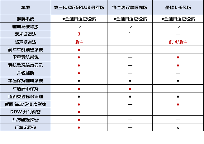 越來越多的用戶注重智能化配置,除了用車便捷性外,還有就是智能化配置對行車安全的賦能提升。為了提升行車安全,第三代CS75PLUS冠軍版、鋒蘭達雙擎領(lǐng)先版、星越L長風版都搭載了L2級智能駕駛輔助系統(tǒng),集成了全速自適應巡航、車道保持輔助、道路交通標識別等功能。但是在這基礎(chǔ)之上,第三代CS75PLUS冠軍版,其L2級智能駕駛輔助還多出可倒車車側(cè)預警系統(tǒng)、并線輔助等功能。盡管三款車里第三代CS75PLUS冠軍版是售價最低的,但它的L2級智能駕駛輔助系統(tǒng)卻是功能最全的。