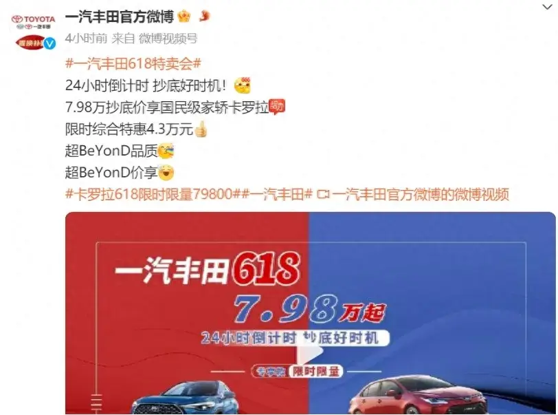 趁著“618年中大促”的熱度,許多合資車企借勢降價促銷。比如一汽豐田舉行24小時限時特賣會,卡羅拉限時綜合優惠4.3萬元,最低只要7.98萬元。而RAV4榮放、bZ3和亞洲龍等車型,終端優惠更是高達6萬元左右。