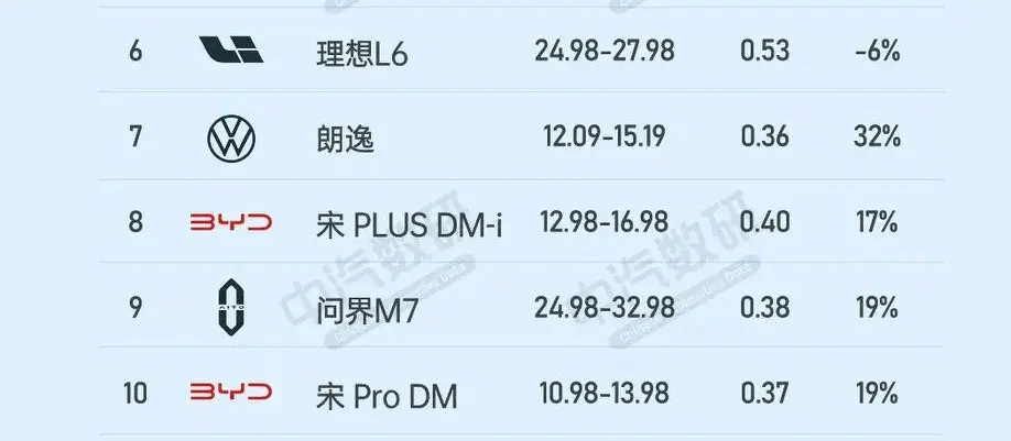 排第二梯隊(duì)車有:理想L6、朗逸、宋 PLUS DM-i、問界M7、宋 Pro DM,其中理想L6銷量0.53萬輛,環(huán)比增減幅度為-6%,排名第6名、朗逸銷量0.36萬輛,環(huán)比增減幅度為32%,排名第7名、宋 PLUS DM-i銷量0.4萬輛,環(huán)比增減幅度為17%,排名第8名、問界M7銷量0.38萬輛,環(huán)比增減幅度為19%,排名第9名、宋 Pro DM銷量0.37萬輛,環(huán)比增減幅度為19%,排名第10名、