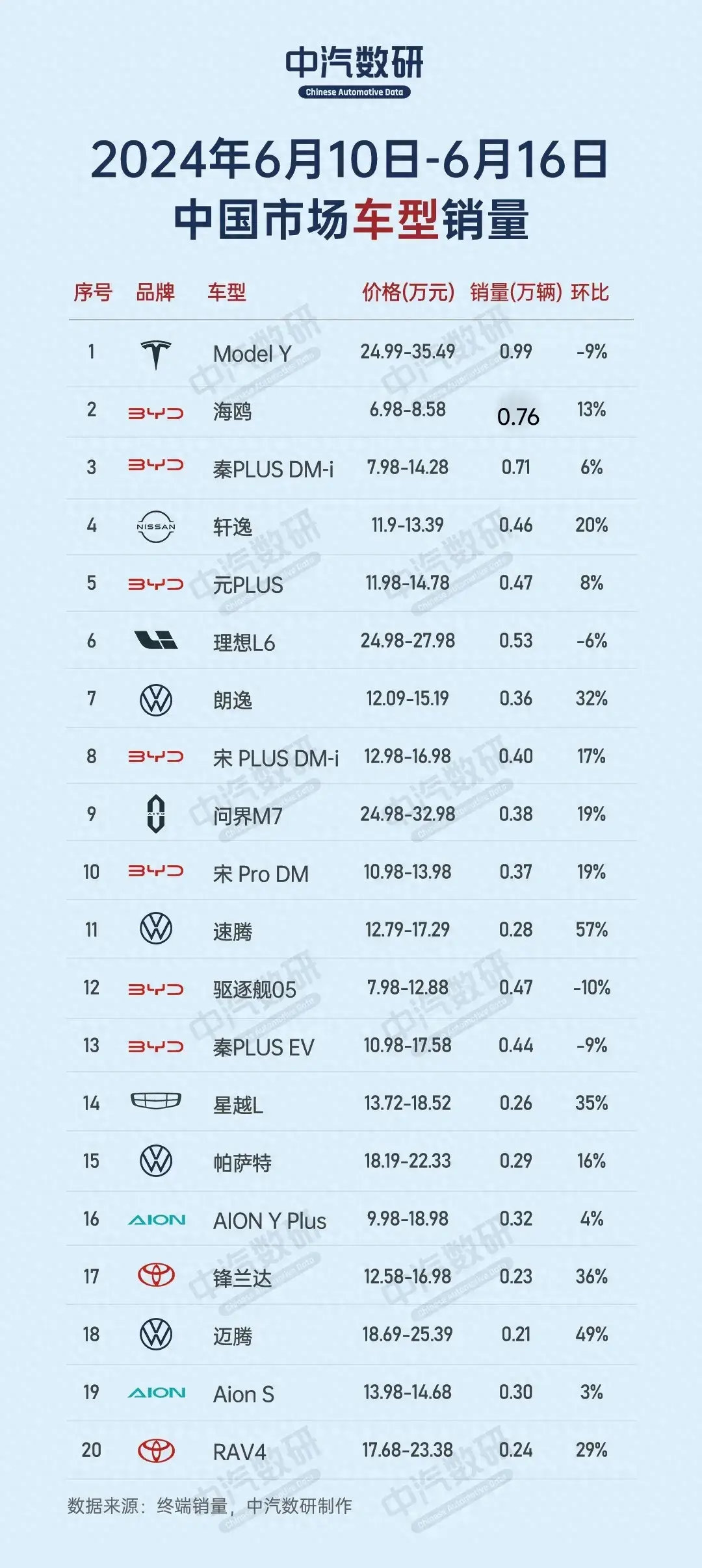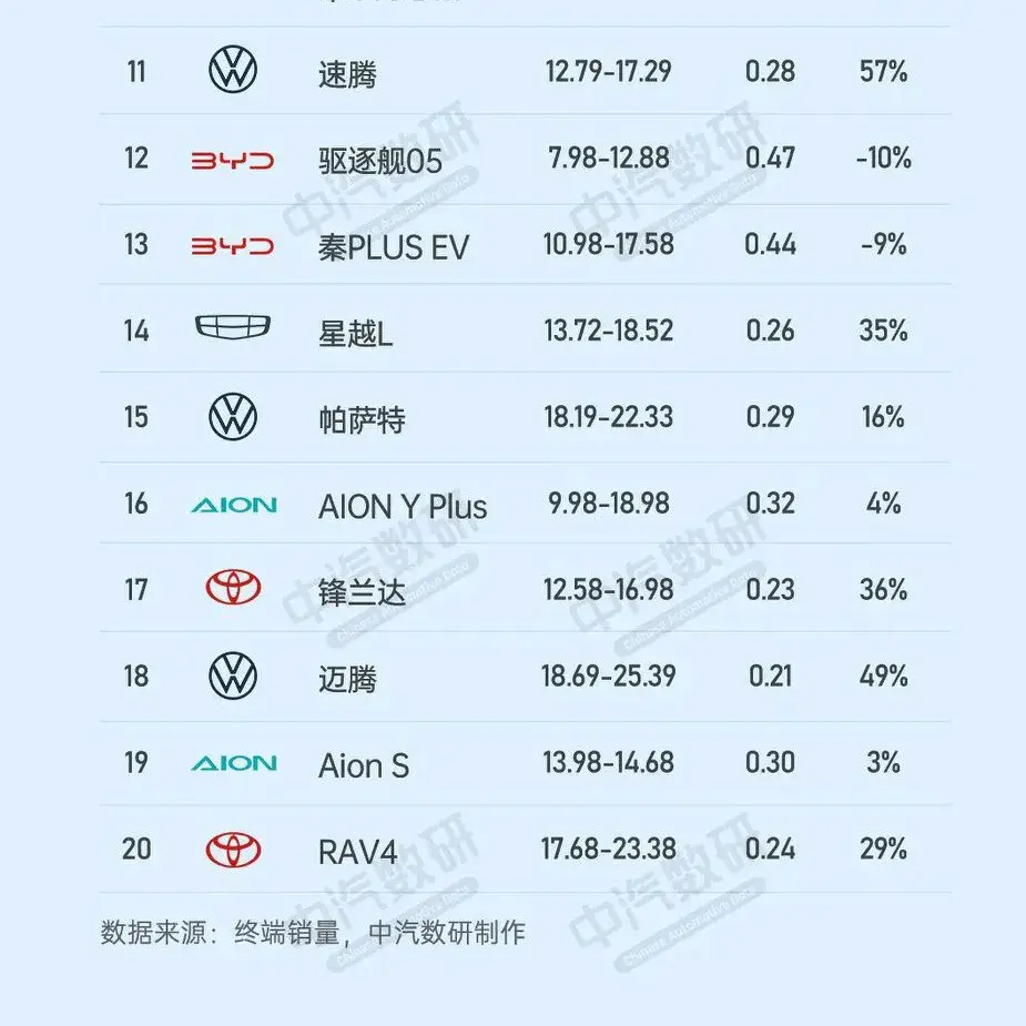 而剩余TOP11-TOP20競爭激烈,速騰銷量0.28萬輛,環(huán)比增減幅度為57%,排名第11名、驅(qū)逐艦05銷量0.47萬輛,環(huán)比增減幅度為-10%,排名第12名、秦PLUS EV銷量0.44萬輛,環(huán)比增減幅度為-9%,排名第13名、星越L銷量0.26萬輛,環(huán)比增減幅度為35%,排名第14名、帕薩特銷量0.29萬輛,環(huán)比增減幅度為16%,排名第15名、AION Y PIuS銷量0.32萬輛,環(huán)比增減幅度為4%,排名第16名、鋒蘭達(dá)銷量0.23萬輛,環(huán)比增減幅度為36%,排名第17名、邁騰銷量0.21萬輛,環(huán)比增減幅度為49%,排名第18名、Aion S銷量0.3萬輛,環(huán)比增減幅度為3%,排名第19名、RAV4銷量0.24萬輛,環(huán)比增減幅度為29%,排名第20名。