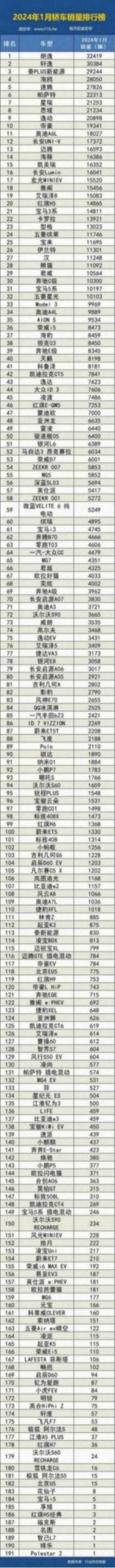 ●2024年1月國內轎車銷量排行