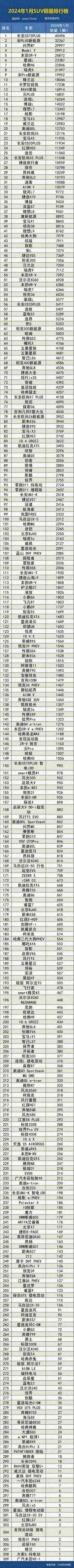●2024年1月國內SUV銷量排行