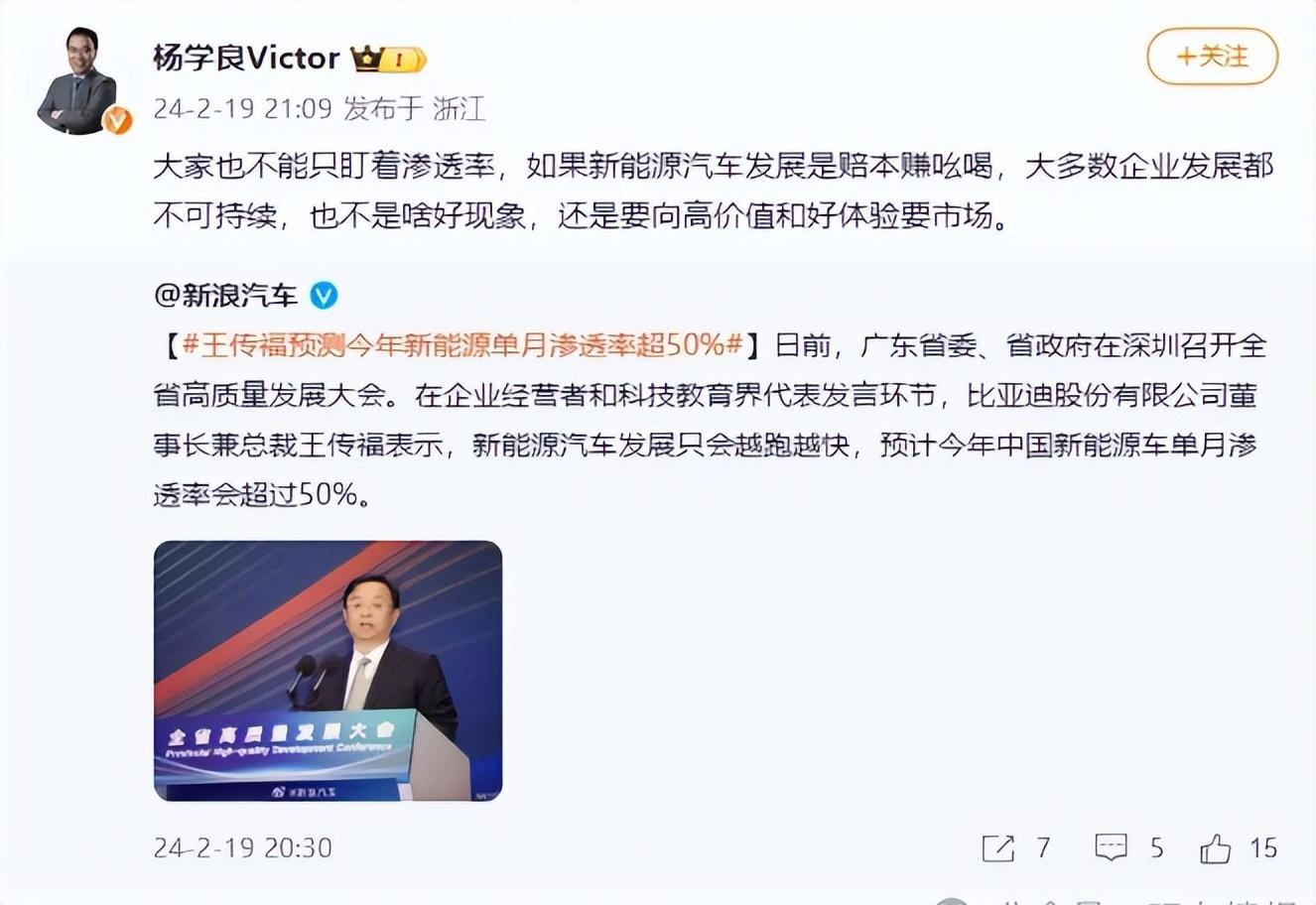 沒過幾天,吉利汽車的高管楊學(xué)良轉(zhuǎn)發(fā)該微博并且寫了如下評論:“大家也不能只盯著滲透率,如果新能源汽車發(fā)展是賠本賺吆喝,大多數(shù)企業(yè)發(fā)展都不可持續(xù),也不是啥好現(xiàn)象,還是要向高價(jià)值和好體驗(yàn)要市場。”