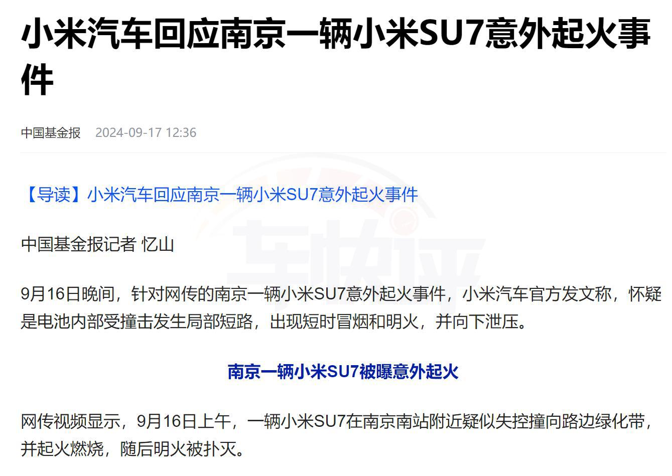 據(jù)媒體報(bào)道,9月16日上午10點(diǎn)左右,在江蘇南京南京站附近,有一輛小米SU7發(fā)生了意外的交通事故,撞上了路邊的花壇,導(dǎo)致車輛底部起火冒煙。