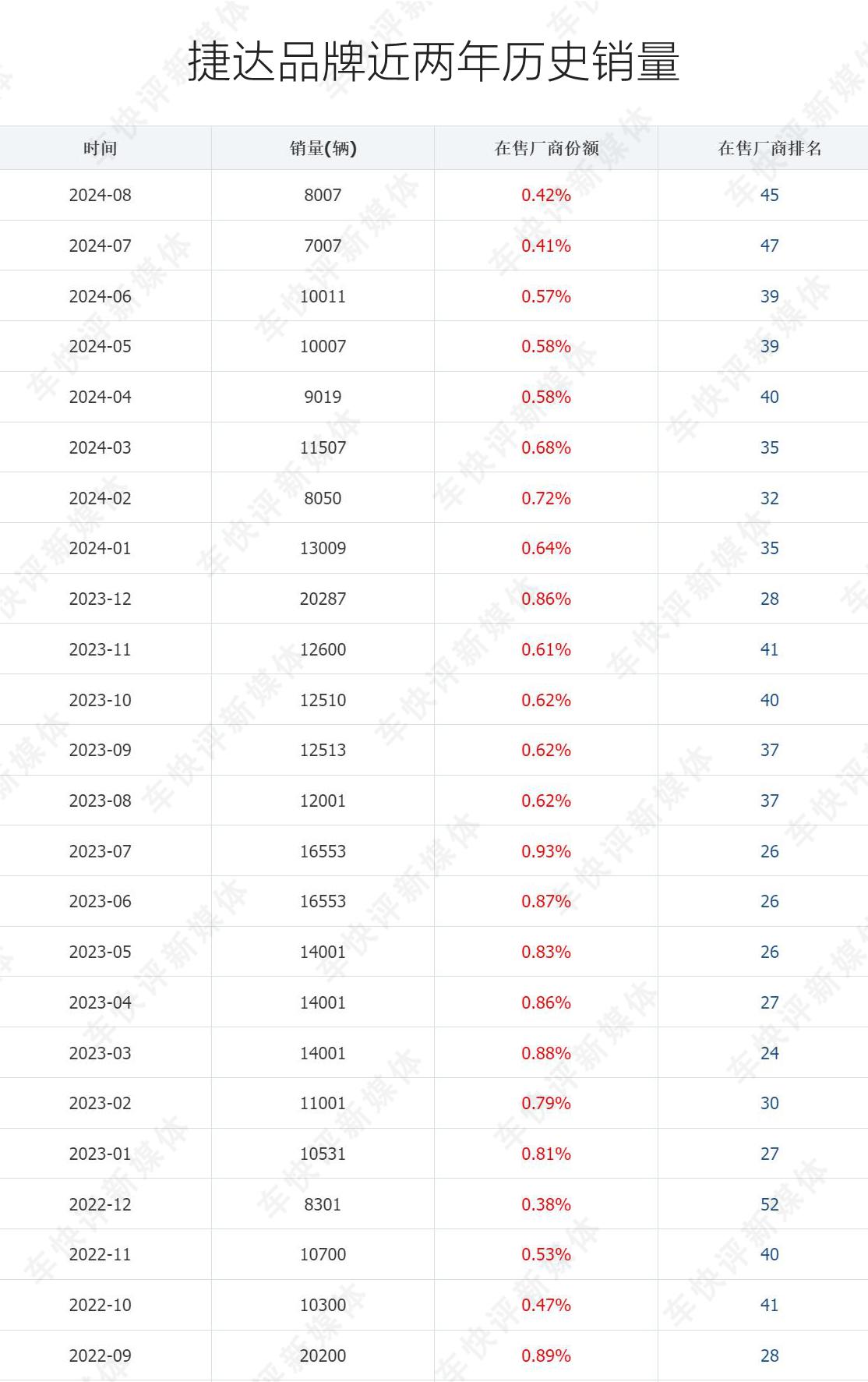 最后來看捷達品牌的市場表現,進入2024年后銷量也出現了明顯的下降。今年的2、4、7和8月捷達全系車型的單月銷量都在萬輛以下。