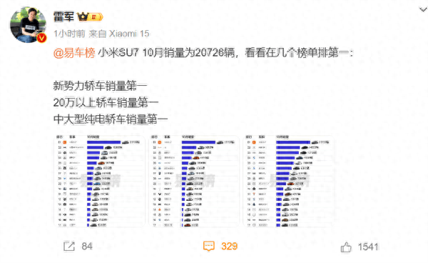 車市“金九銀十”效應顯著,小米汽車僅憑單一車型SU7,在10月份一舉奪得三項銷量第一。此成績不僅碾壓一眾造車新勢力,更是超越老牌豪華車企“BBA”,雷軍也在社交媒體分享了這一好消息。
