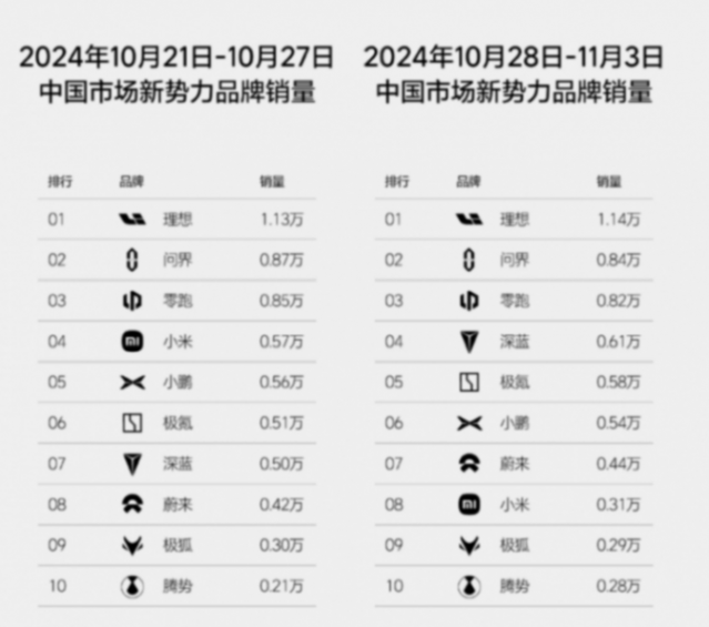 第44周新能源汽車銷量排行榜出爐,理想汽車連續28周排名第一,小米汽車銷量大跌,深藍汽車銷量提升明顯,排名取代小米,特斯拉銷量暴漲,排名上升,問界、零跑汽車銷量保持穩定,排名膠著。