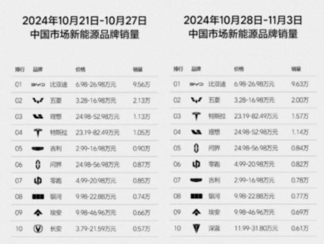 44周銷量榜:小米銷量大跌,特斯拉暴漲,深藍排名上升,問界零跑