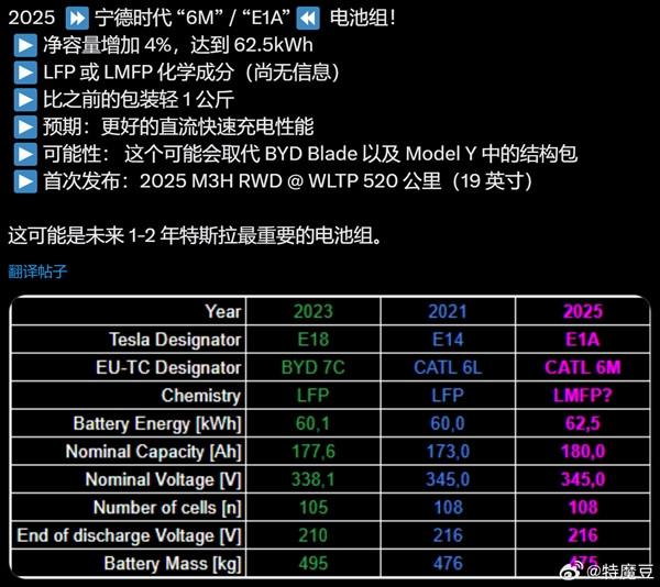 與此同時,海外博主也發現了特斯拉新電池包的相關信息。據悉,特斯拉將采用2025款寧德時代“6M”/“E1A”電池包,該電池包的容量從之前的60度增加到了62.5度,同時總重量還降低了1kg。而在此之前,特斯拉所使用的是比亞迪刀片電池。曝光的信息還顯示,這款新電池包將首發搭載在2025款M3H后驅車型上,其WLTP續航里程達到了520公里。預計這款M3H后驅車型將是改款后的Model Y車型。