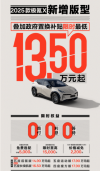2025款極氪X新版車型在11月1日(今日)正式上市,最低售價14.9萬,疊加政府置換補貼后最低13.5萬元,同時還調(diào)整了老款車型價格。除了價格上的優(yōu)惠,全系車型還可享受0首付、0利息的金融政策,權(quán)益價值最高可達(dá)6.32萬元。同時,購車者還能享受18000元的政府置換補貼等額外優(yōu)惠。