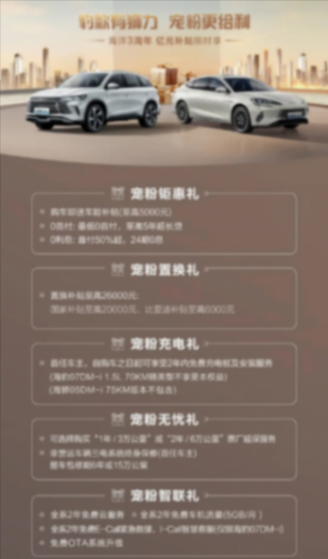 在比亞迪海洋網(wǎng)3周年之際,公司推出了針對海豹07 DM和海獅05 DM車型的億元補貼活動。購車者可享受最高5000元的車險補貼和最高2.6萬元的置換補貼(含國家補貼和比亞迪補貼),同時還有最低0首付至高5年超長貸的金融方案。活動截止至11月30日。