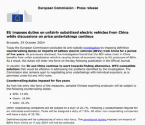 歐盟從2024年7月4日起就已經對從中國進口的電動汽車征收了臨時關稅,從2024年10月31日起征收正式關稅。其中,對比亞迪、吉利和上汽分別加征17.0%、18.8%和35.3%的關稅(上述三家企業配合了抽樣調查);將對配合調查但未被抽樣的中國電動汽車生產商加征20.7%的關稅;對其他不配合調查的中國電動汽車制造商加征35.3%的關稅;對在中國生產的特斯拉加征7.8%的關稅。此次額外關稅是之前的10%關稅基礎上加征,上汽及其他不配合公司的關稅為將提高至45.3%。