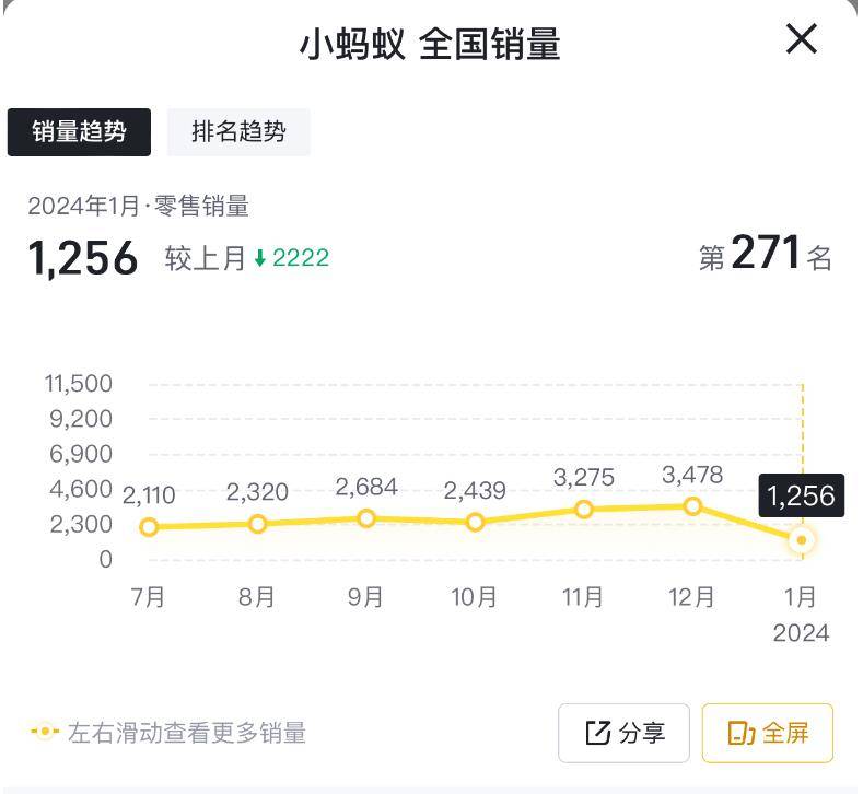 行業(yè)綜合銷量數(shù)據(jù)顯示,2024年1月份,奇瑞小螞蟻的單月零售銷量為1256臺。相比上個月,奇瑞小螞蟻的銷量下滑了63.88%。