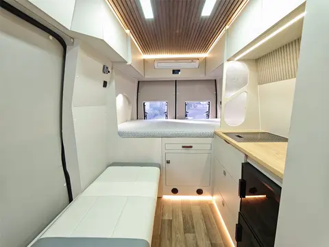 新星云景Pro福順房車的內飾設計精致,家具做工細膩。車廂內側的廚房組柜和儲物柜設計合理,能夠滿足日常露營的儲物需求。車內空間布局合理,細節處理得非常到位,讓露營生活更加舒適便捷。內飾風格上表現更為中庸,屬于中規中矩的裝飾,色彩相對單一,以純色系為主。