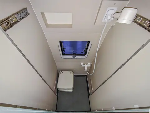 新星云景Pro福順房車配備了獨立的衛生間,采用抽拉式的設計,可以有效利用空間。衛生間內部配備了便攜式馬桶和獨立的淋浴系統,可以滿足用戶的基本洗漱需求。同時,衛生間還配備了外推窗,增加了通風效果。