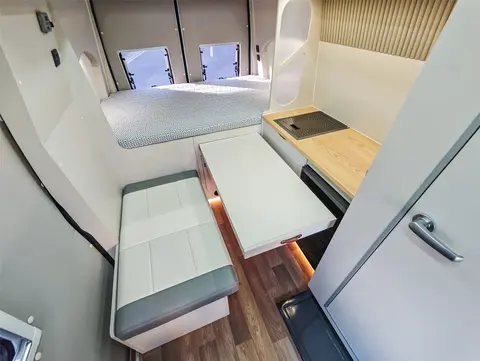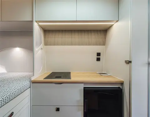 新星云景Pro福順房車的生活區采用了側坐沙發的設計,直接面對廚房區,可以坐下兩人。從整個布局和座位來看,這臺車更適合兩人自駕出行露營。沙發組可以展開成為一張床,滿足臨時休息的需求。車廂中部沒有設置固定餐桌休息區,而是以一張條形沙發代替,搭配隱藏餐桌,也可以實現日常的吃飯、休閑功能。