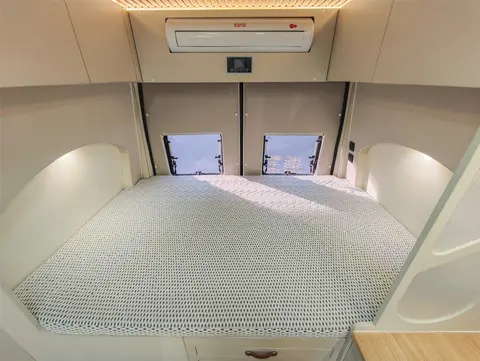 新星云景Pro福順房車的睡臥區位于車尾部,提供了一張橫置雙人床。雖然沒有提供具體尺寸,但目測整張床長度會達到1米8以上,寬度1米4以上,足夠睡下兩名成年人。上方還有一個空調和換氣扇,保證了睡臥區的舒適度和通風效果。