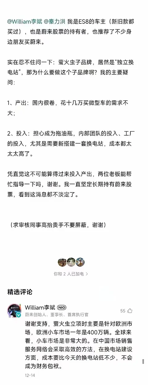 對于螢火蟲的出現,有蔚來股票投資者、ES8車主對此表示出了擔憂,他艾特了李斌和秦力洪,提出了自己的兩點質疑: