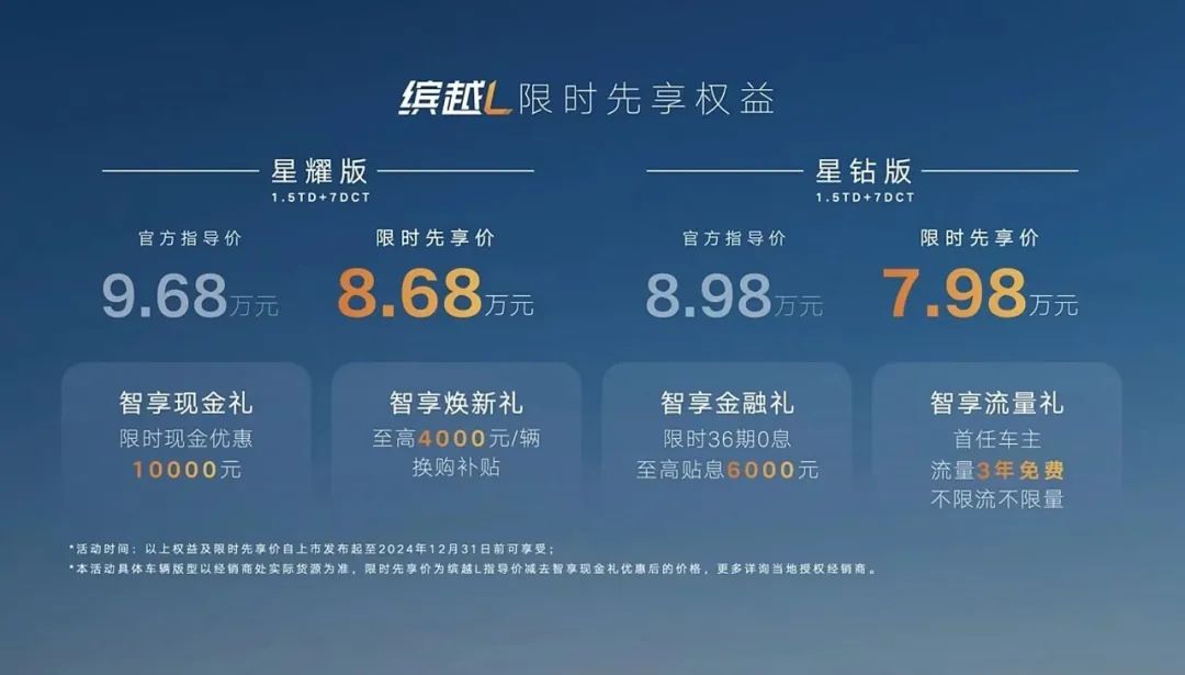第三款車型是剛上市不久的吉利繽越L,作為改款車型,其外觀升級、內飾進化,另外就是有限時先享價,星耀是高配版本,目前售價也只要8.68萬,落地價在10萬內事沒問題的,很有競爭力了。