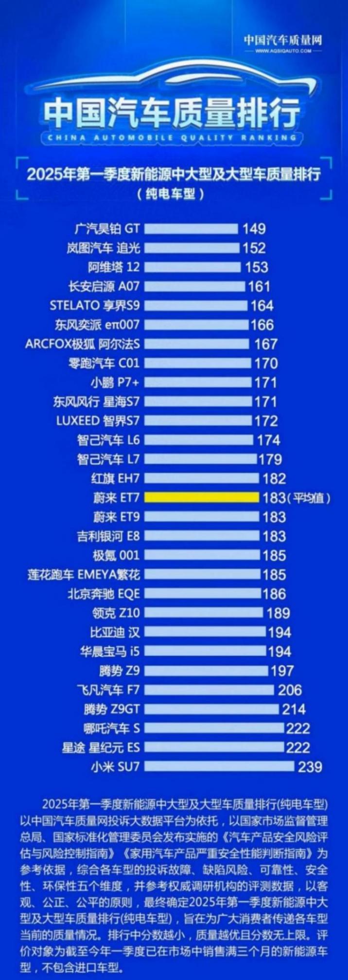 中國汽車質量網發布了2025年第一季度新能源中大型及大型車質量排行,排行中分數越小,質量越優且分數無上限。其中廣汽昊鉑GT、嵐圖追光和阿維塔12排名前三,而小米SU7卻是最后一名!這數據是怎么統計的?