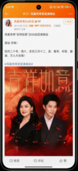 2月28日,#鳳凰傳奇官宣演唱會#登上熱搜。當天中午,玲花與曾毅紛紛在微博官宣2024巡回演唱會首站濟南:“四月二十號,周六,農歷三月十二,宜:看秀,聽歌,蹦迪,萬人大合唱! ”網友紛紛回應:“期待一起大合唱。”