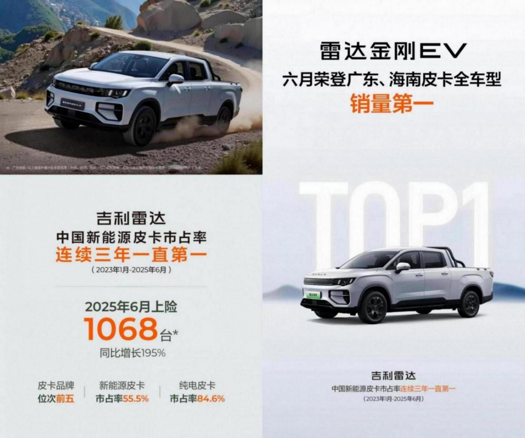 新能源皮卡到底行不行,一直是行業(yè)關(guān)注的焦點(diǎn)話題,如今數(shù)據(jù)給出了明確答案。最新上險(xiǎn)數(shù)據(jù)顯示,6月吉利雷達(dá)全系皮卡銷量達(dá)1068輛,同比暴漲195%,以55.5%的市占率穩(wěn)坐新能源皮卡頭把交椅,其中純電車型市占率高達(dá)84.6%,展現(xiàn)出統(tǒng)治級(jí)優(yōu)勢(shì)。