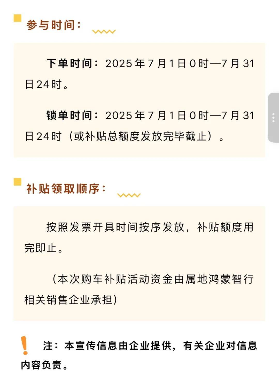 幾天之前,安徽省汽車經銷商商會宣布,自2025年7月9日至2025年7月31日開展新能源汽車促消費活動。對“在安徽省內所有門店購買鴻蒙智行全系車型”的自然人消費者,且在安徽省內上“皖”牌的,給予每輛車3000元的現金補貼,以下定減免尾款的方式實現。活動總金額360萬元(數量1200輛),先到先得,用完即止。
