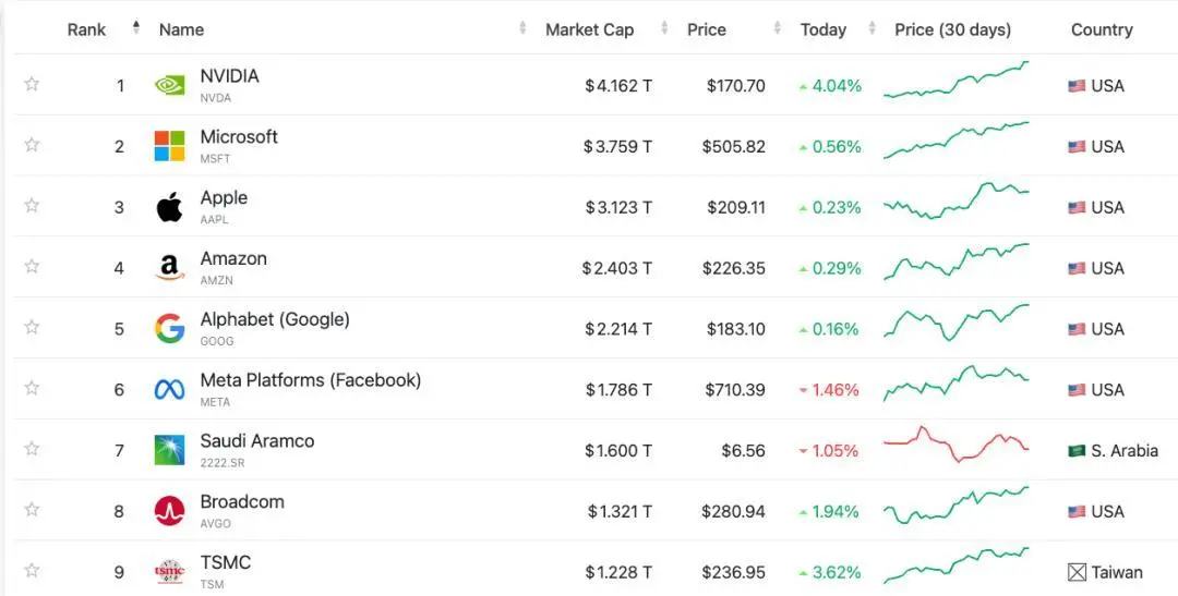 截至本周二7月15日,全球市值超過3萬億美元的公司只有三家,英偉達(dá)第一4.17萬億美元,第二名微軟3.76萬億美元,第三名蘋果3.12萬億美元。