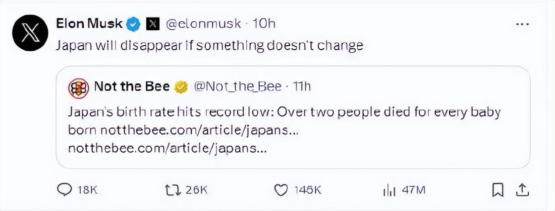 馬斯克轉發了一位X用戶分享的這條消息,并評論稱:“如果情況不改變,日本將會消失。”