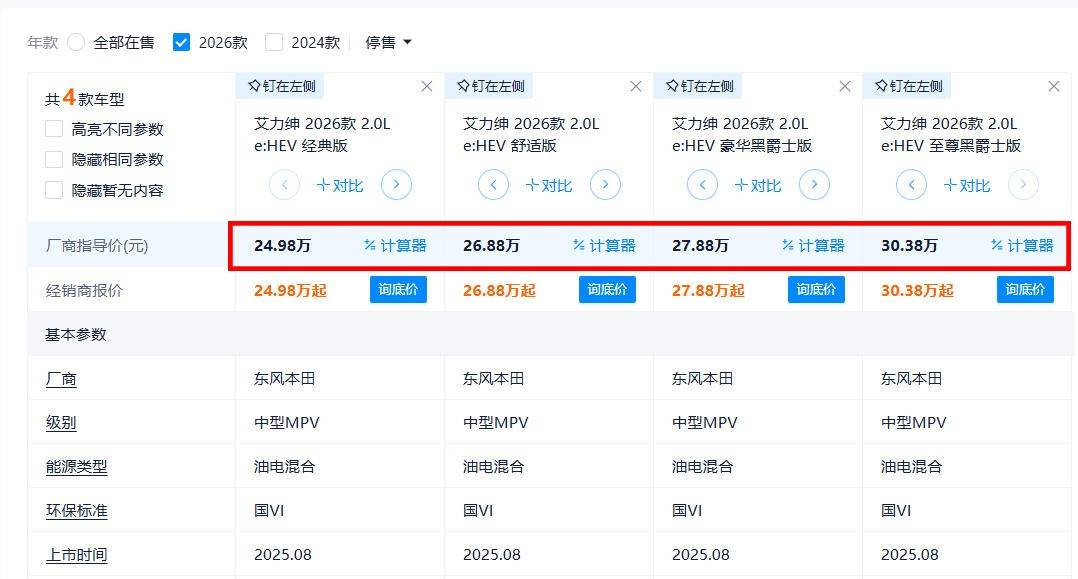 8月26日,東風本田上市了新款艾力紳車型(2026款),新車售價24.98-30.38萬元,相較于此前的老款(2024款)車型,在起售價上降低了3萬元(27.98萬起售),同時官方還提供至高3.68萬元的權益,包含購置稅全免、置換補貼、基礎保養權益等。