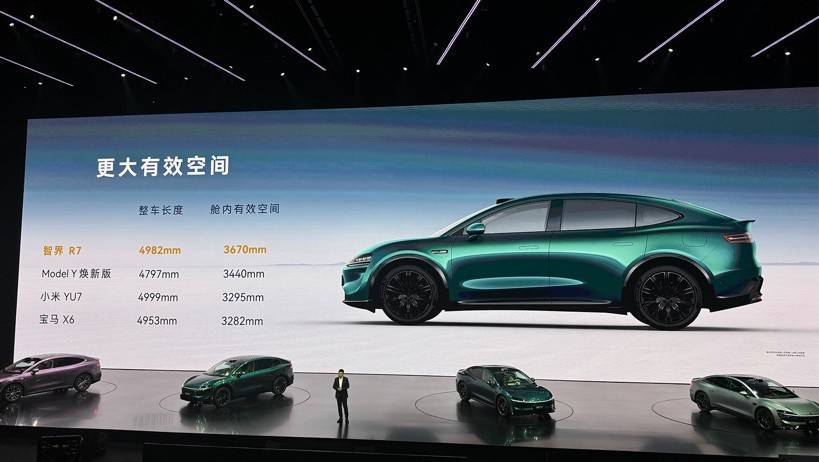 在發布會上,智界毫不掩飾狙擊小米的心。在介紹智界R7時,余承東多次將核心參數與小米YU7做對比。比如,智界R7的整車長度與艙內有效空間的數據高于小米YU7;0.219的風阻系數比小米YU7低,甚至比Model Y煥新版還要低。