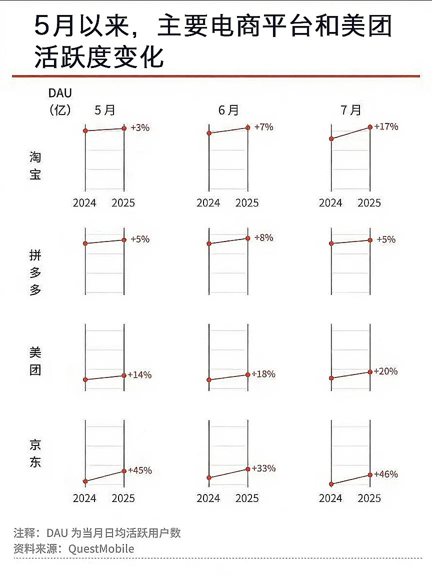 第三方數(shù)據(jù)公司QuestMobile監(jiān)測(cè)的數(shù)據(jù)顯示,今年7月,淘寶APP的日均活躍用戶數(shù)(DAU)上升,同比去年7月增長(zhǎng)17%,相比其他電商平臺(tái)的領(lǐng)先優(yōu)勢(shì)加強(qiáng)。