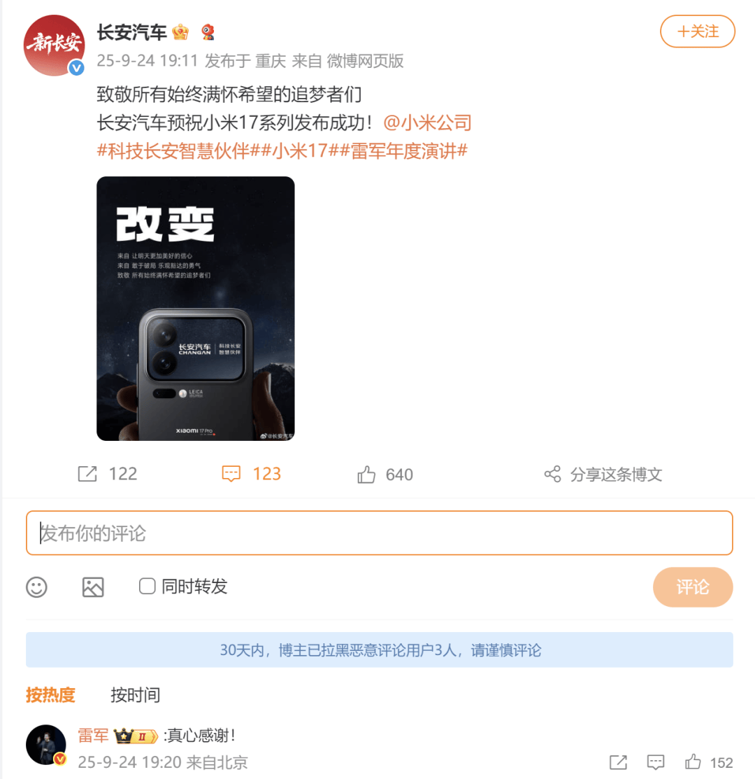 這場本屬手機圈的發布會,卻意外獲得多家車企公開致敬。長安汽車發文“致敬所有始終滿懷希望的追夢者們”,預祝小米17系列發布成功。