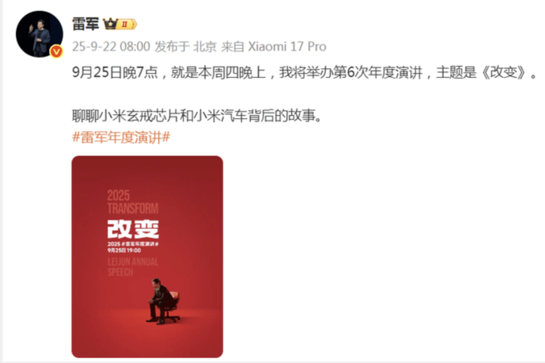 9月25日晚7點,雷軍將舉辦第六次年度演講,主題為《改變》,分享小米玄戒芯片和背后的故事。同場發布的還有小米17系列手機。
