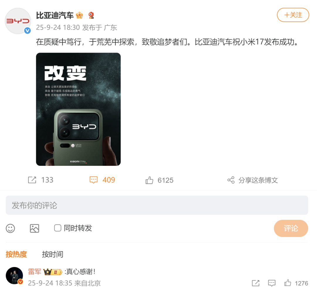 9月24日晚間,比亞迪汽車官方微博一句“在質疑中篤行,于荒蕪中探索,致敬追夢者們”,為次日發布的小米17系列送上祝福。雷軍隨即評論“真心感謝”。