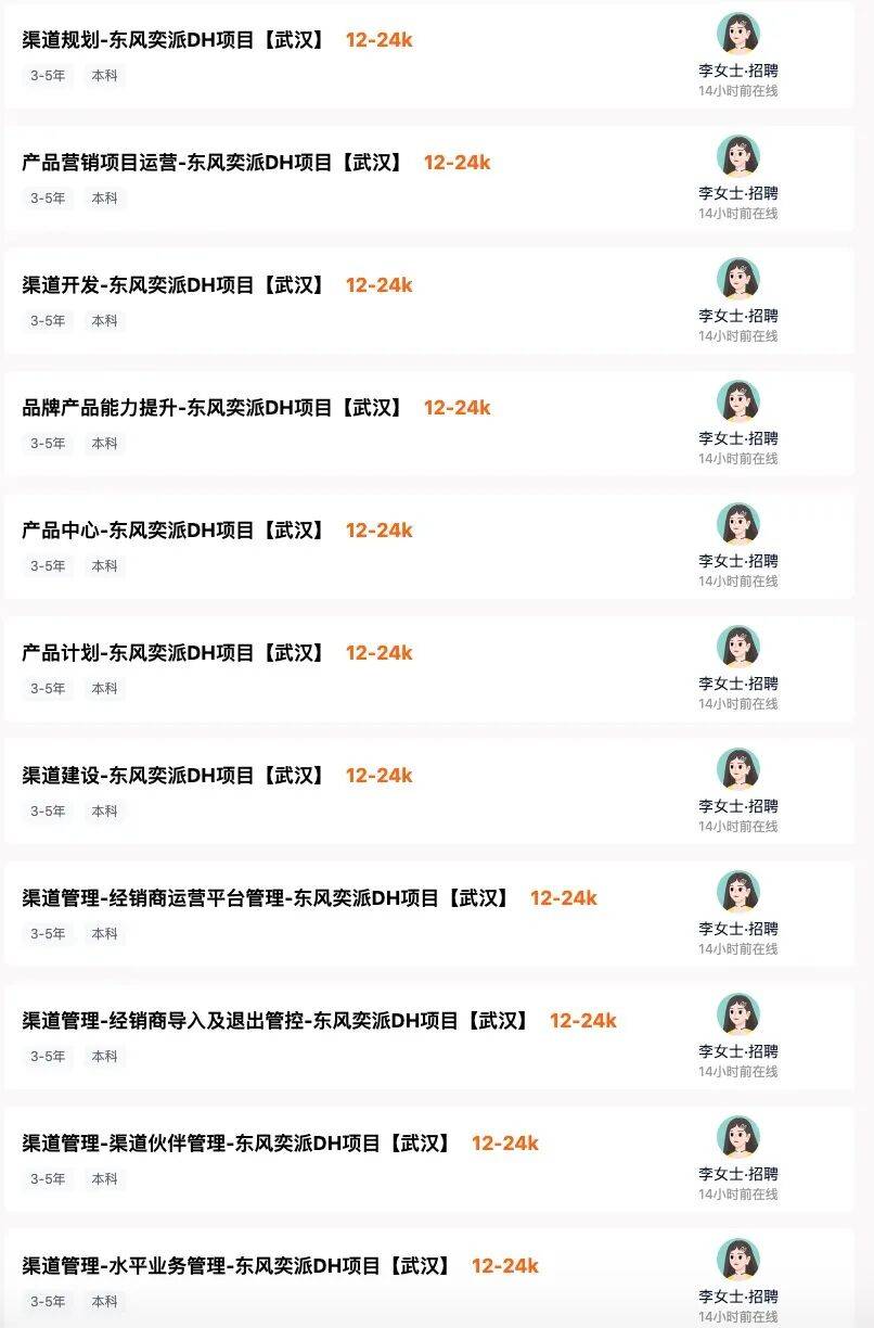 此外,近期還有爆料稱,為確保DH項目順利推進,東風集團正籌備成立全新的新能源公司,研發團隊整合了原東風日產技術中心的核心力量,并將遷至武漢辦公。與此同時,東風奕派DH項目已啟動大規模人才招募。飛靈汽車查詢第三方招聘軟件注意到,DH項目正在招聘渠道管理建設、整合營銷項目運營、公關傳播、新媒體運營、服務運營等崗位,工作地點均為武漢。
