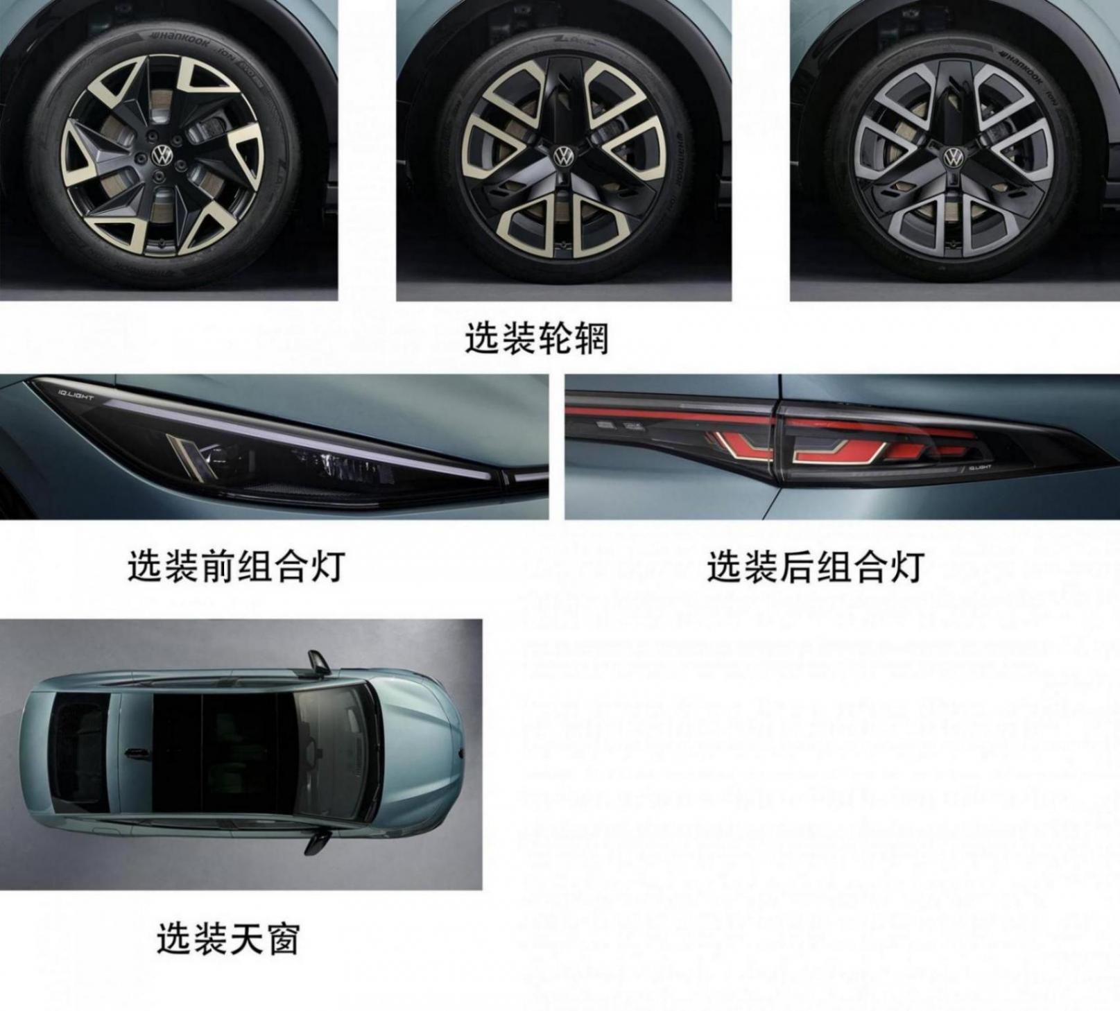 配置方面,采用19英寸、20英寸尺寸的輪轂,三種輪轂樣式,甚至還用了金色輪轂邊緣裝飾。一個細節是,這次與眾07的后剎車改為了盤剎,不再是之前ID系列使用的鼓剎。同時前后大燈有些選裝,玻璃天窗也是選裝。