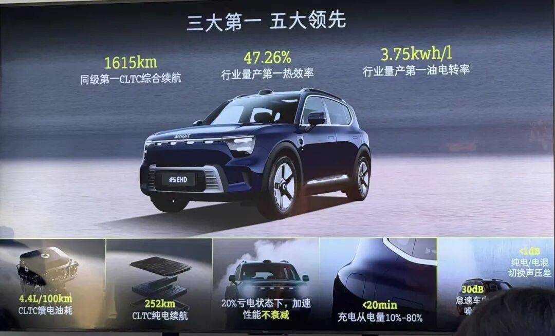 比如最新推出的smart#5 精靈5號(hào)所搭載的EHD超級(jí)電混系統(tǒng),跟吉利旗下高端品牌領(lǐng)克和極氪就屬“同根同源”。這套行業(yè)領(lǐng)先的雷神電混2.0系統(tǒng),讓精靈5號(hào)新車(chē)CLTC綜合續(xù)航實(shí)現(xiàn)1615km,熱效率高達(dá)47.26%,達(dá)到當(dāng)前行業(yè)量產(chǎn)發(fā)動(dòng)機(jī)的最高水平。