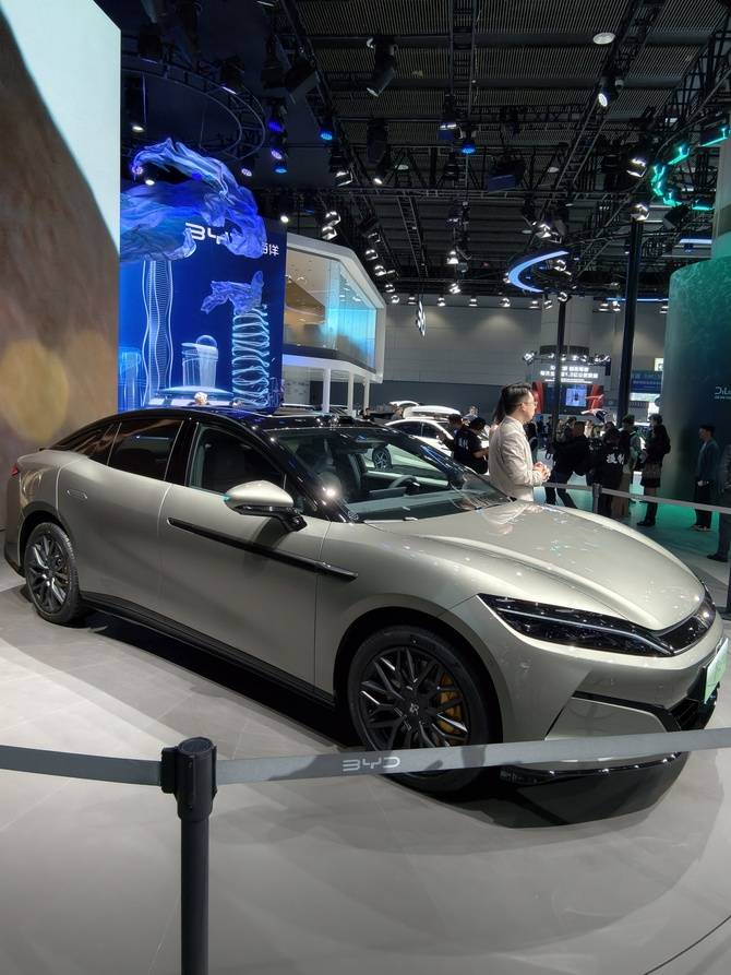 說一下感受,現場燈光的照射下,比亞迪漢L的橄欖綠有一種很特別的質感,