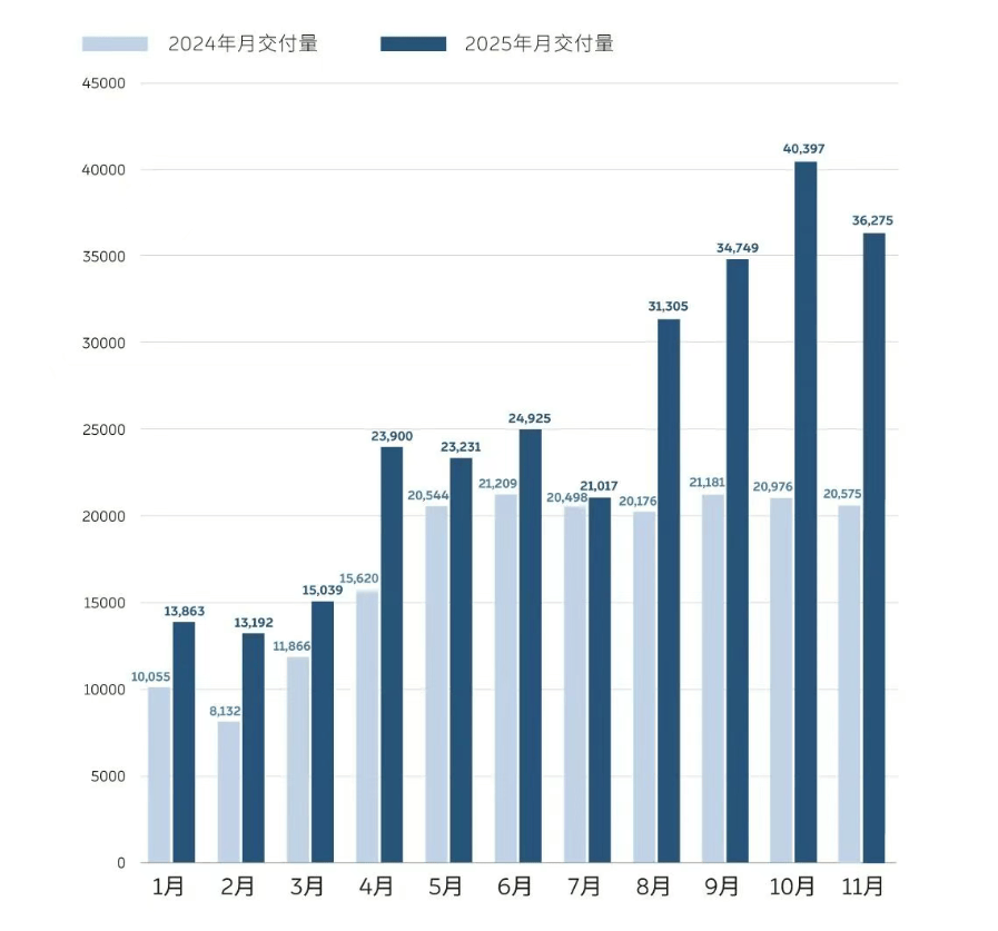 小米汽車11月保持穩定輸出,交付量持續超過4萬臺,已連續三個月維持在這一水平之上。穩定的交付表現反映出其制造與供應鏈體系的日趨成熟。