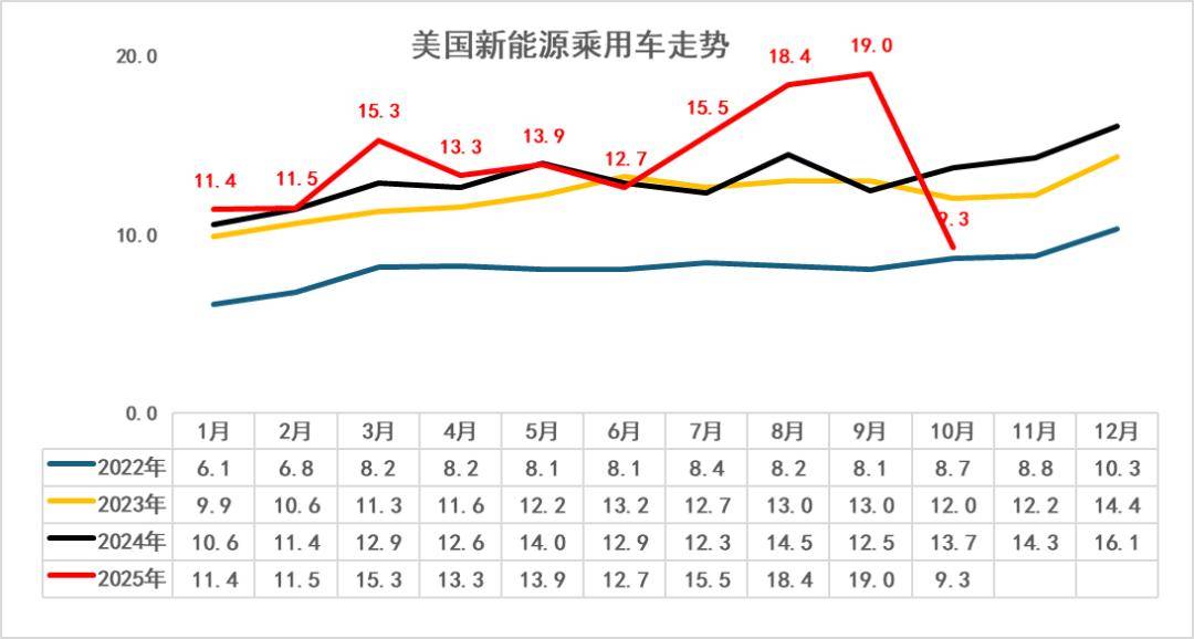 歐洲純電動車的份額從2021年26%,到2023年下降到20%的水平,2025年1-10月的份額相對回落到17.2%。今年美國電動車份額僅有9.5%,10月的5.2%的表現下降。