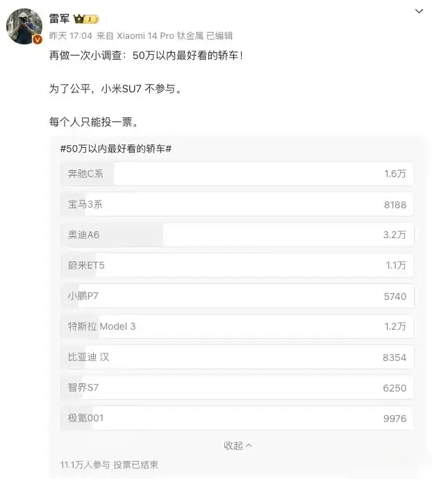 雷軍發起這場投票活動,不僅是為了增加小米的影響力,更是為了推廣小米汽車。通過這種方式,小米汽車的品牌形象得到了提升,也為小米汽車未來的銷售打下了基礎。同時,雷軍的這一舉動也展示了他的商業智慧和創新能力,再次證明了他在商業領域的卓越成就。